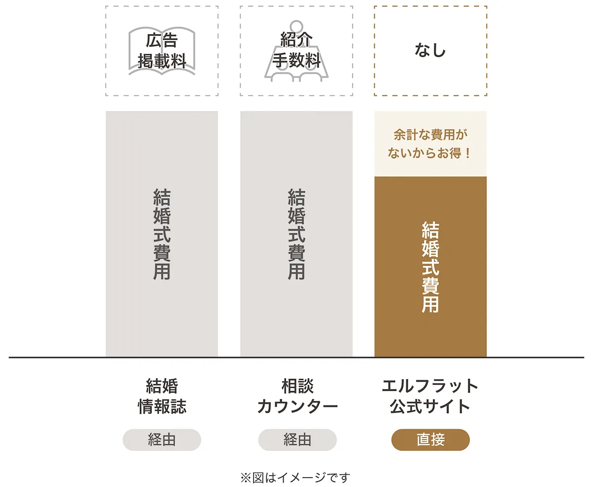 他の式場紹介サイトや式場紹介デスク・相談カウンターで発生する掲載料や紹介料が存在しないので、